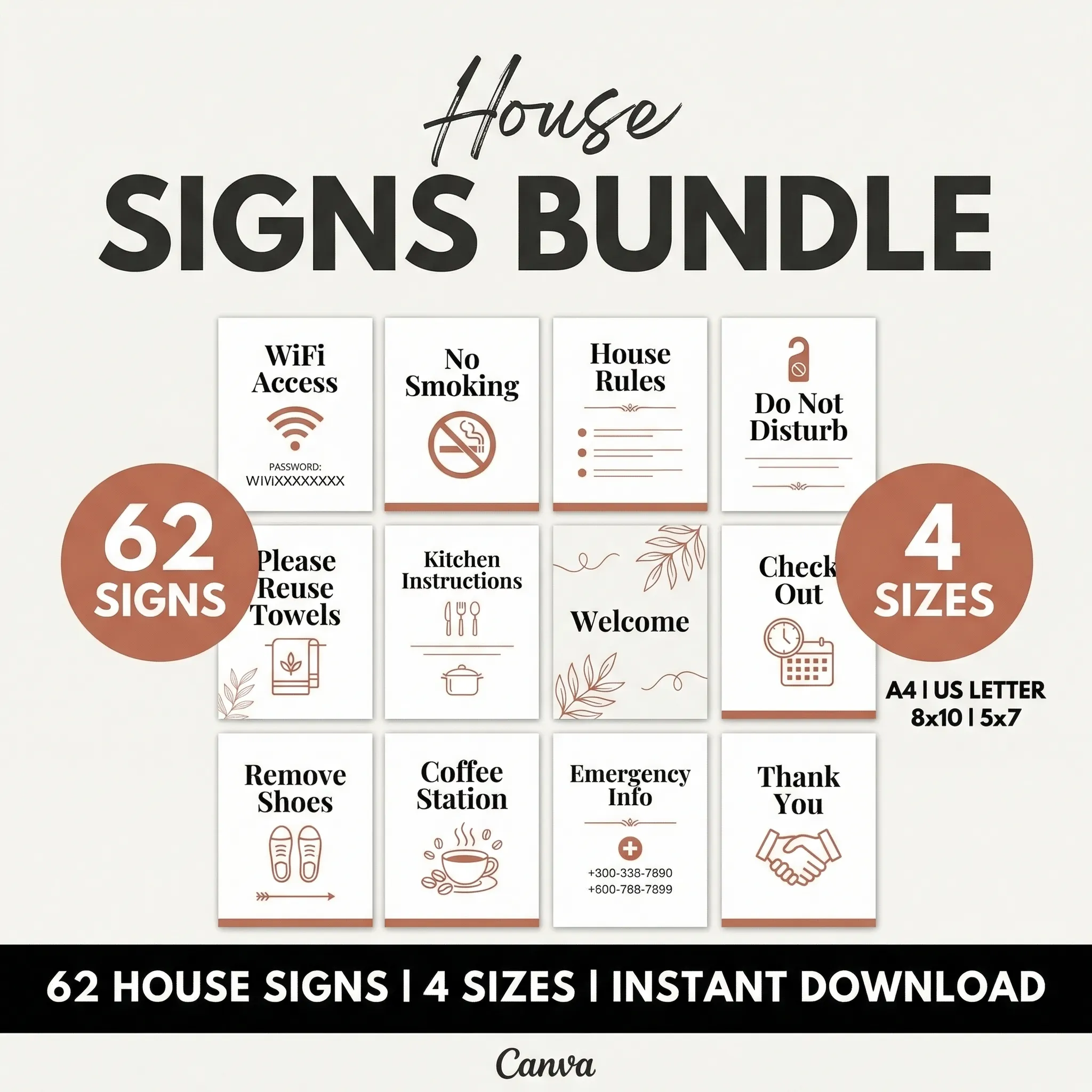 62 signs that cover every corner of your property: WiFi, checkout reminders, kitchen rules, bathroom labels, do-not-disturb, and more. Print at home or at any print shop.