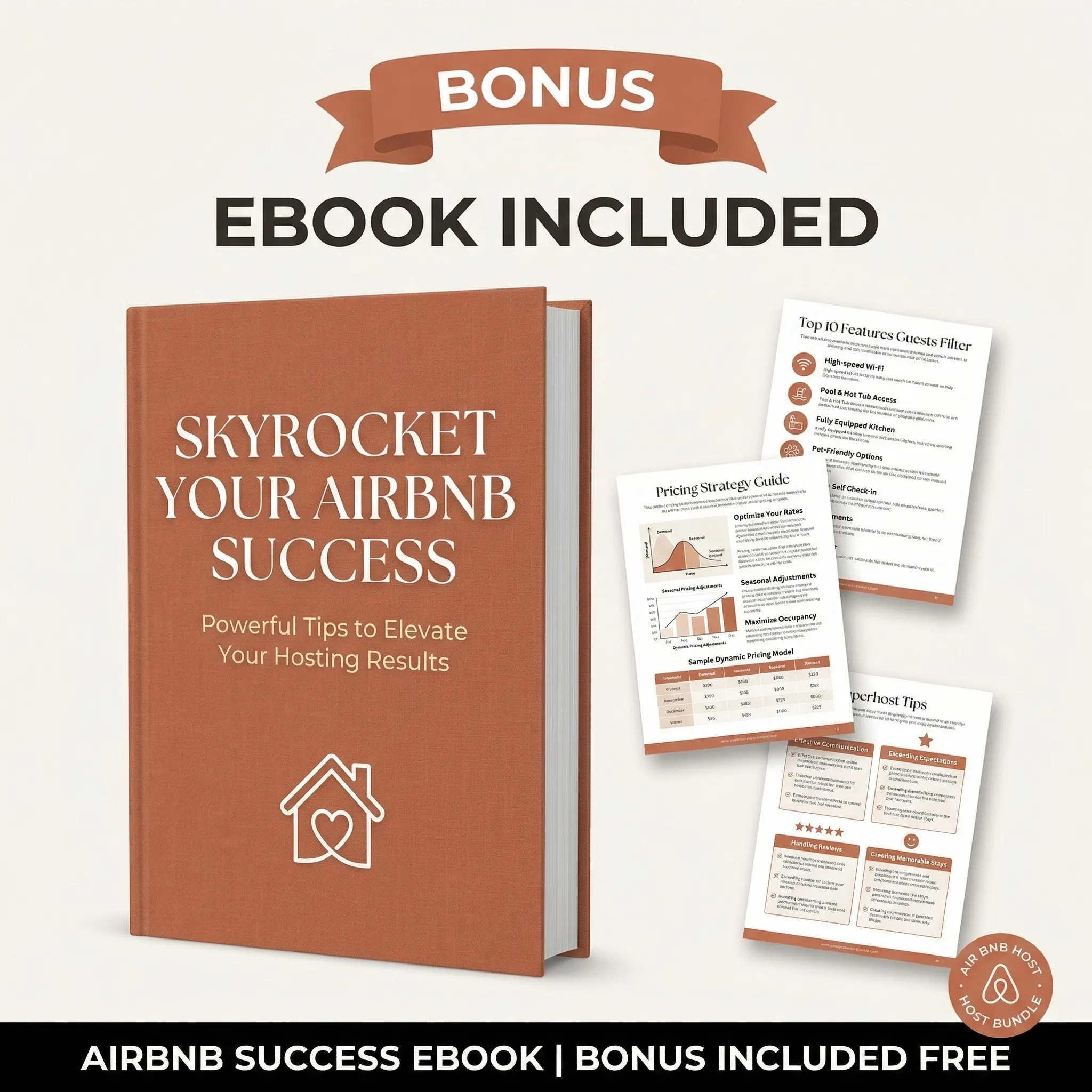 The eBook covers the tactics top-rated hosts use: pricing strategy, how to get more 5-star reviews, and how to grow direct bookings so you're not dependent on Airbnb's platform. Comes with 42 Reels templates and a 9-tab bookkeeping spreadsheet.
